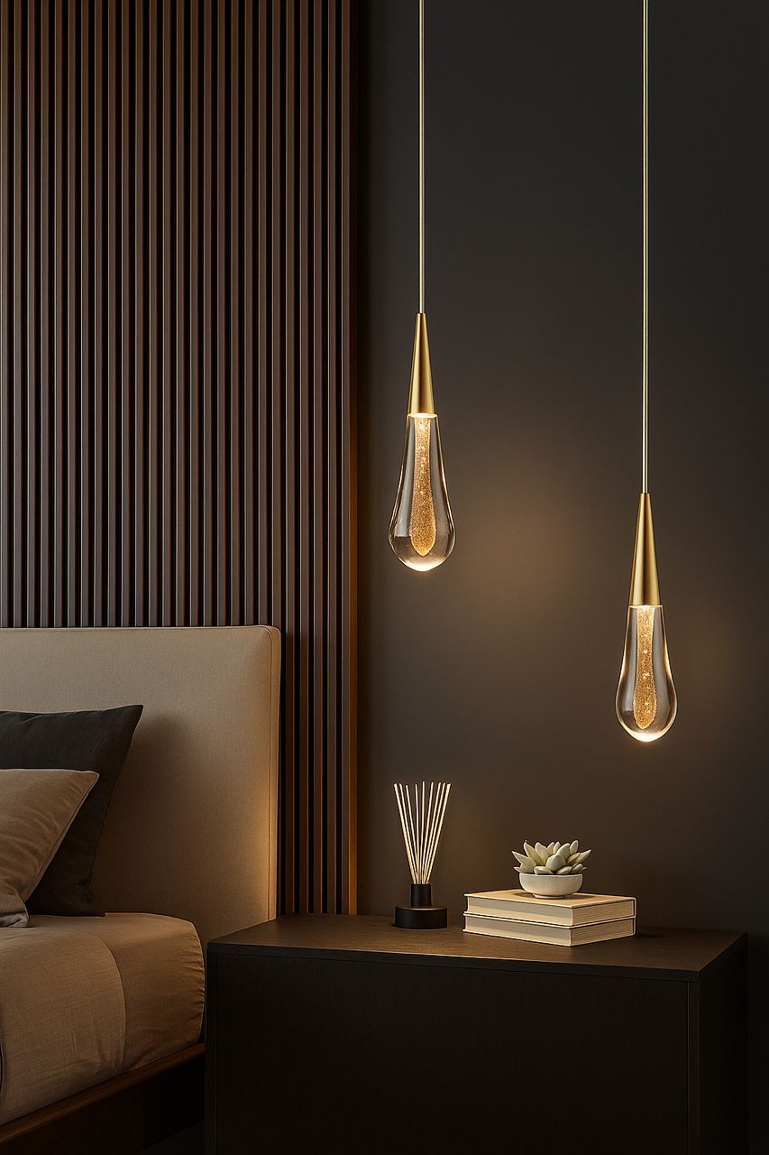 Suspension LED en forme de goutte d’eau avec lumière douce et design élégant.